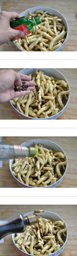 2. 4小時后,倒出腌出來的水,倒入高度白酒,少許花椒,倒入白醋,姜芽、白醋的比例是10:1,倒入少許醬油,增色,按照姜芽、白糖10:1的比例倒入白糖,還可灑入紅辣椒、大蒜片,或者倒入蒜泥,拌勻后裝進干凈無油的容器里,腌漬一周即可食用。學做菜
