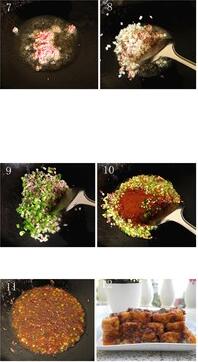 5、把炒制好的醬汁淋在炸好的豆腐上,這道一品豆腐就做好了。