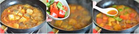 4.坐鍋倒油,油6成熱時將裹好生粉的魚塊放入,用中火煎至魚塊二面金黃,倒入調(diào)好碗汁,煮開后用小火燉10分鐘左右。加入青紅椒塊再加1小勺香油拌勻后即可出鍋。