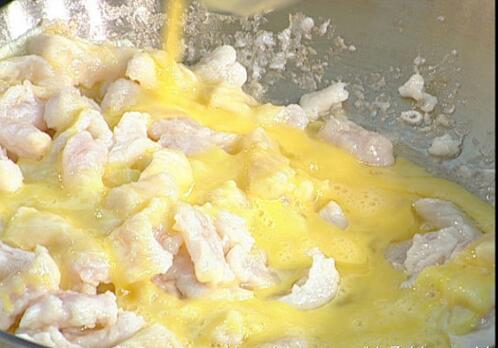 3 坐鍋倒油燒六七成熱時下入漿好的魚條進行煸炒,炒至六成熟時倒入打好的蛋液,讓每一塊肉上面都包裹上一層蛋液,最后倒入調(diào)好的碗汁,撒上枸杞,炒勻后即可出鍋