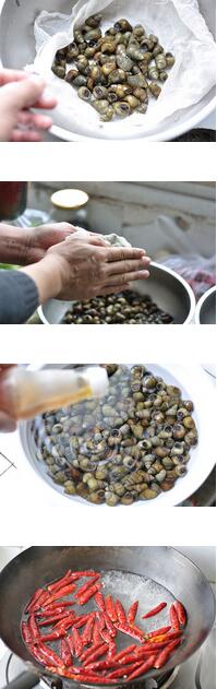 1.田螺用水洗掉泥污(把表面有污漬或青苔的田螺用紗布包住,或裝進(jìn)蛇皮袋子里,用手搓幾下就可去掉田螺表面比較頑固的贓物)