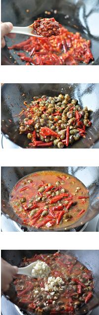 6.坐鍋倒油,油熱后放入姜絲爆香,倒入搗好的辣椒醬,炒香,放入一湯匙郫縣紅油豆瓣,炒香,再倒入控凈水的田螺,大火翻炒,倒進(jìn)沒(méi)過(guò)田螺的清水,大火煮開(kāi)后改小火煮至湯汁濃稠,倒入切好的蒜粒,翻炒均勻即可出鍋。的做法