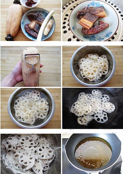 1.臘肉清洗干凈,上鍋蒸15分鐘后取出,蔥姜切碎,豆瓣醬同樣剁碎備用,蓮藕清洗干凈后,刮去表皮,切片后入開水鍋焯熟,撈出后控干水分,撒入兩勺干淀粉拌勻,使每片蓮藕都沾滿干粉
