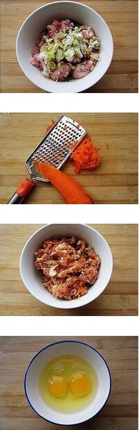 蛋餃的材料:雞蛋2個(gè),肉餡150g,干淀粉2小勺,胡蘿卜半根,蔥,,鹽1小勺,生抽1小勺,花生油1小勺,麻油1/2小勺,清水2小勺