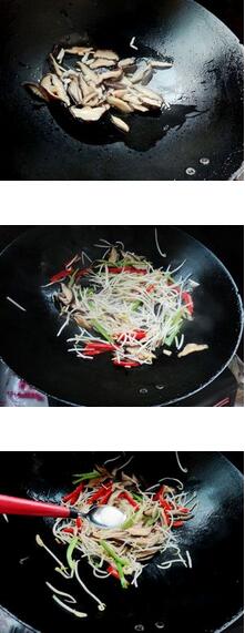 2 坐鍋倒油燒熱,下蒜末炒香,放入香菇翻炒幾下,加入豆芽和青紅椒絲翻炒,調入鹽和少許的味精翻炒均勻即可起鍋。
