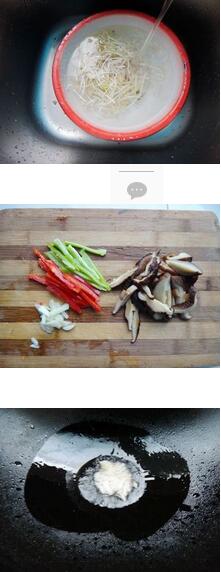 香菇炒豆芽的材料:綠豆芽200g,干香菇四朵,青紅椒,鹽,蒜末