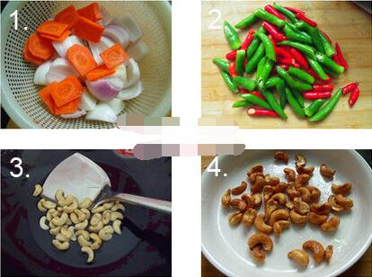 3、腰果用小火炒金黃撈出晾涼,把辣椒炒一下,皮有泡泡為好。