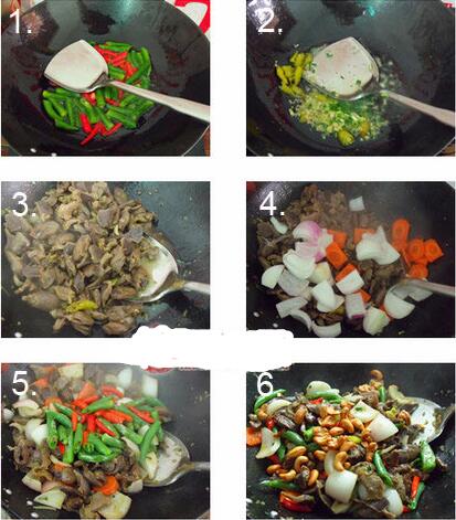 4、熱鍋冷油,燒五成熱,下蔥姜泡椒,炒一下,倒入雞雜,糖,十三香,一起翻炒出香味,雞雜水分炒出。放點料酒,生抽,翻勻,放洋蔥胡蘿卜,炒斷生,調(diào)入鹽,把辣椒倒入,翻炒到湯汁變干放點香醋。淋香油,放味精。翻炒均勻即可在出鍋放腰果,也可以裝好盤再撒。 怎么做好吃