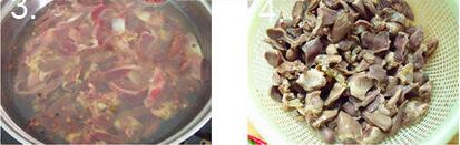 1、雞胗切片,雞心一剖二,坐鍋倒水水中放花椒煮開,倒入雞胗雞心,煮開,放一點料酒,不蓋鍋蓋,煮幾分鐘,煮好的鍋里有很多臟東西,要沖洗干凈,瀝干備用。