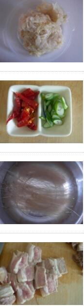 酸菜白肉粉條的材料:醋泡包菜1/4個(gè),粉絲1把,水煮白肉1塊,紅椒,香蔥2根,生姜,油2茶匙,鹽,胡椒