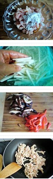 山藥炒肉絲的材料:山藥300g,里脊肉200g,香菇8朵,紅椒,蔥姜,鹽,料酒10g,糖3g,胡椒粉1g,雞精1g,淀粉,香,山藥,肉絲