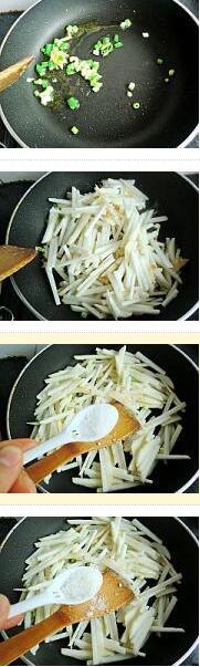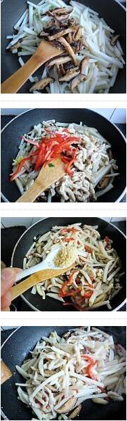 2..炒鍋到油燒熱倒入肉絲翻炒至變色盛出備用,鍋中再稍加一點(diǎn)油爆香蔥姜,倒入山藥翻炒均勻,加入鹽翻炒,再加適量的白糖,把香菇倒入加入少許清水燒煮片刻,放入炒過的肉絲和紅椒絲翻炒均勻,加少許雞精,最后淋入少許香油出鍋