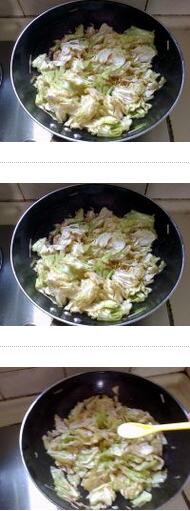 4、熱鍋冷油,下入蒜末爆香,加入汆燙的包菜翻炒,倒入腐乳汁、白糖、雞粉和紅椒絲翻炒融和,關(guān)火,順著鍋沿倒入白酒即可起鍋。