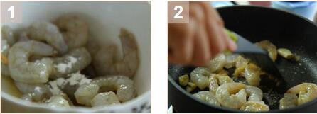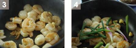 2. 先燒熱油鍋,煎香蝦仁至顏色轉(zhuǎn)粉紅,然后加入荔枝煮多1分鐘。3. 混合生粉和水,再加入蝦仁中炒勻,并加入蔥。