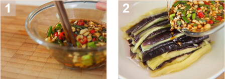 1.茄子洗凈切段后放入蒸鍋蒸15分鐘左右出鍋,備用。