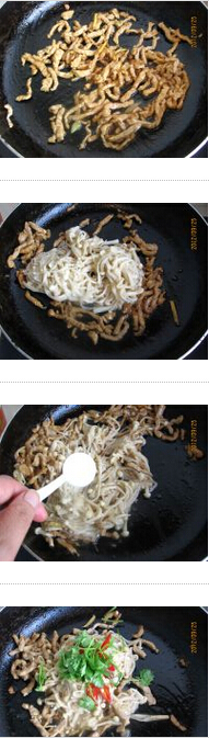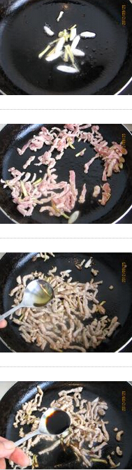 4.鍋中放少許油(如果炒金針菇時(shí)放油多,這時(shí)就不必放了)炒香蔥姜,加入肉絲快速翻炒,炒至肉變白,加入料酒,再次炒勻后,加入,醬油,再次快速炒勻,放入炒好的金針菇,加入,鹽,再次炒勻后放少許香菜辣椒段點(diǎn)綴。