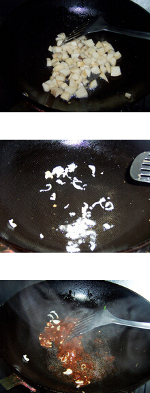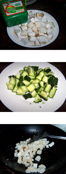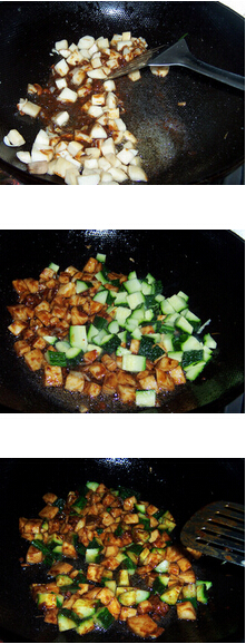 3.另起鍋,注入油,爆香蔥碎,加入1大勺豆瓣醬和糖,煸炒均勻。 4.加入煸炒好的杏鮑菇丁,翻炒均勻,再加入黃瓜丁,胡蘿卜丁,繼續(xù)煸炒,煸炒至每粒杏鮑菇和黃瓜丁都能夠均勻沾滿醬汁,加入雞精調(diào)味即可。