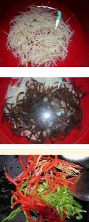 五彩藕絲的材料:青紅椒,嫩藕,水發(fā)木耳,嫩姜,味精,白糖,白醋,花椒油