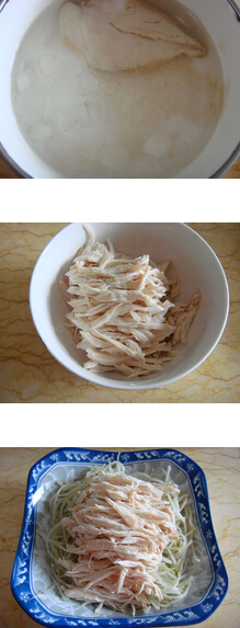3.再用清水加八角,桂皮,大火燒開后,倒適量料酒,放入雞肉,15分鐘后,撈起放進冰水中過涼2分鐘,撈起把它撕成雞絲