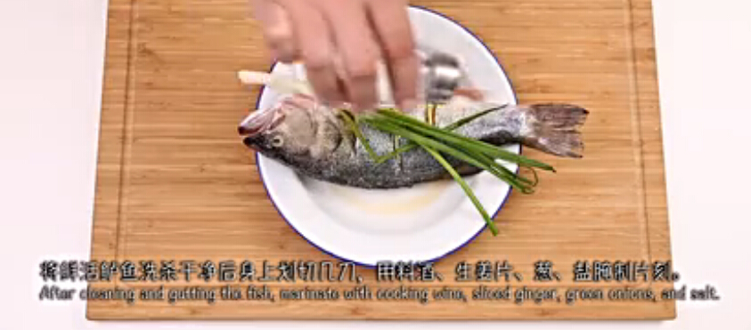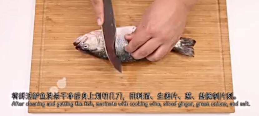 2.將鮮活鱸魚洗殺干凈后身上劃切幾刀,用料酒、生姜汁腌制片刻。
