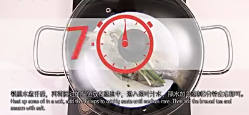 3.鍋里水煮開后,再將腌過的鱸魚放在蒸盤中,淋入茶葉汁水、加適量鹽后,隔水加蓋蒸制。