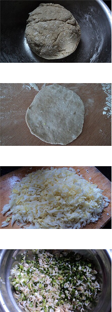 燙面包子的材料:面粉,地瓜粉,大白菜,韭菜,蝦皮,蔥,姜
