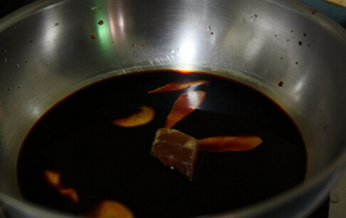 4、 將30g姜切片,姜片,老抽,30g紅糖和500ML水一起放在炒鍋里。