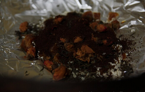8、在炒鍋里,鋪上錫紙,錫紙上面放一層大米,放上120g紅糖塊,撒上紅茶,撒上咖啡粉,最后撒上玫瑰花,熏制的材料全鋪在錫紙上面。