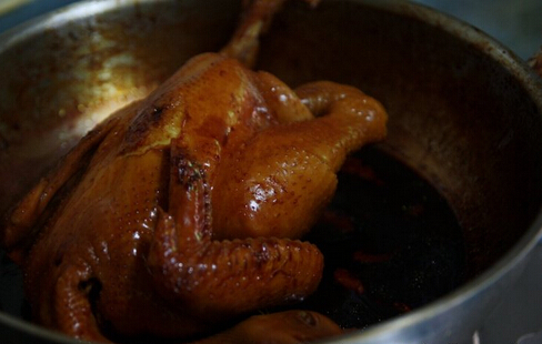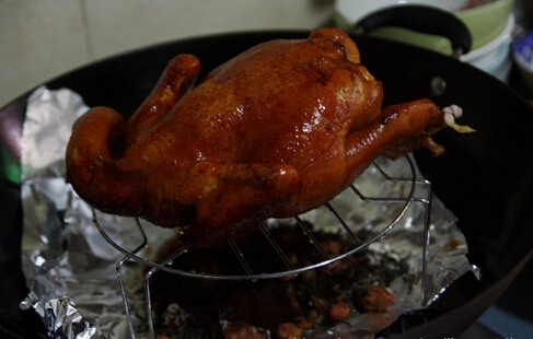 9、將煮熟的雞只放在架子上面,架子下面是熏制的材料,蓋上蓋子,大火燒8分鐘,關(guān)火。