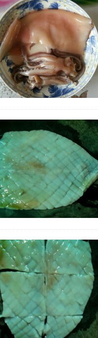 1. 魷魚開膛,去內(nèi)臟撕掉薄膜,然后清洗干凈。