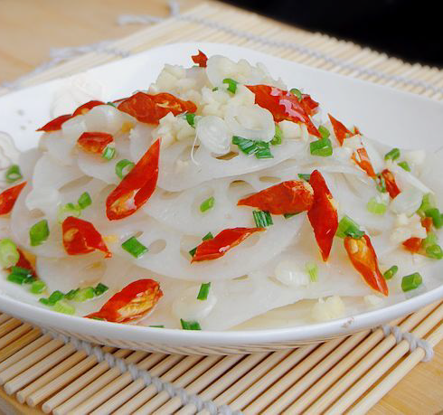 7、8、在藕片上撒上蒜末、香蔥末和剪好的紅椒段,然后起鍋燒熱適量油至冒煙,澆在藕片上即可。