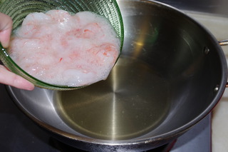 6 將蝦仁慢慢倒入燒熱的鍋內(nèi)