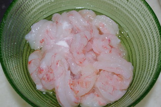 2 蝦仁用刀開背,取凈蝦線,放入一個(gè)蛋清和適量鹽,攪拌均勻后放一旁入味15分鐘