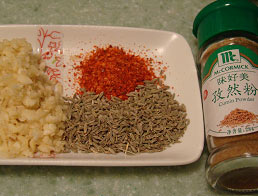 2 蒜末、辣椒面、孜然粒、鹽。