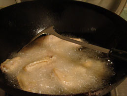 3 雞翅下油鍋炸,至表皮金黃,中小火慢慢的炸。