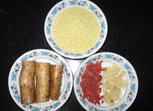 山藥(切粒狀)、百合、枸杞、小米(大米、糯米均可)各適量,
