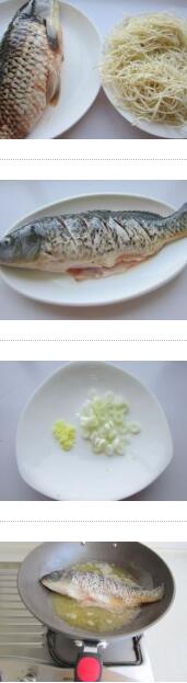 鯉魚培面的材料:鯉魚700克,新鮮龍須面200克,油,鹽8克,生抽5克,料酒3克,香5克,白糖3克,番茄醬2克,大蔥10克,5克,水淀粉