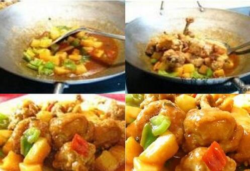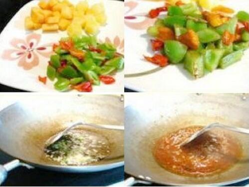 5 坐炒鍋下入適量底油將姜蒜末、干蔥末炒香后放入番茄醬、茄汁、醬油、醋、糖、少許水淀粉,攪拌均勻,再倒入青紅椒、菠蘿塊、哈密瓜塊翻炒片刻后倒入雞翅根繼續(xù)翻勻,讓翅根沾滿汁即可出鍋啦