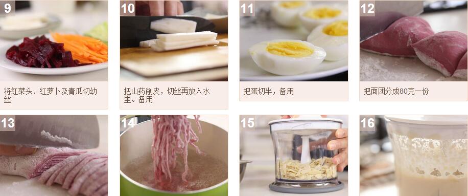 配料:山藥30克。紅菜頭20克。烚蛋1只,紅蘿卜10克。青瓜10克。