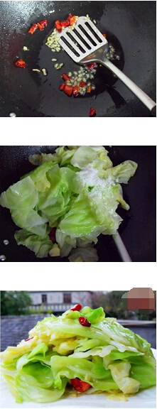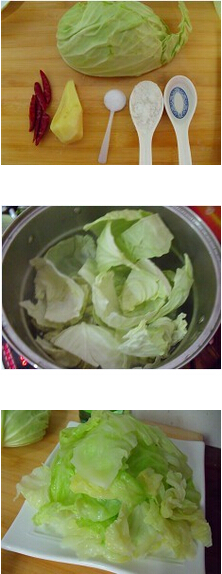 1.圓白菜半個用手掰成片,下開水焯燙撈出,生姜三片姜切末,干紅辣椒切段