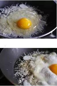 2.在奶酪上打入一只雞蛋,中小火煎制,慢慢奶酪變得酥脆,雞蛋熟到自己想要的程度,用鏟子將雞蛋連同奶酪酥一起放入餐盤中撒上和黑胡椒調味就可以開吃了。