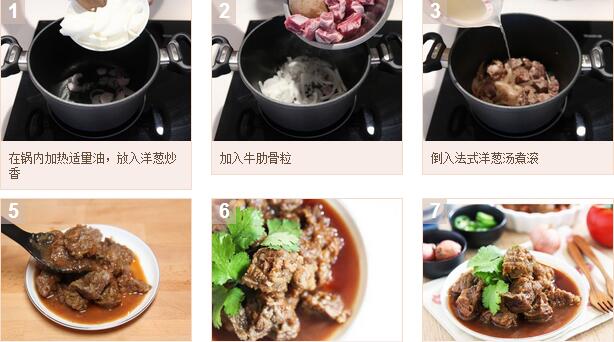 1.在鍋內(nèi)加熱適量油,放入洋蔥炒香;加入牛肋骨粒,煎至呈金棕色;