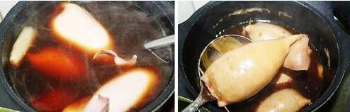 4、之前先將小湯鍋中放入清水(能沒(méi)過(guò)魷魚(yú)的量就可以),再放入蔥姜、八角、花椒、老抽、蠔油、冰糖燒開(kāi),再放入灌好的魷魚(yú)米腸,倒入少許料酒,蓋上鍋蓋小火微開(kāi)的程度煮40分鐘后撈出。不燙手的時(shí)候切成片即可,涼后切更漂亮。