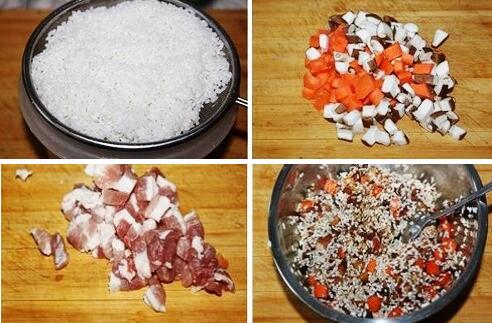 1、將糯米泡一夜,手指能碾碎的程度就可以,撈出控一下多余的水分。將香菇和胡蘿卜都切成小方丁。 美食網(wǎng)