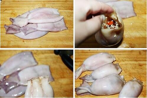 3、魷魚(yú)去掉頭留作它用,魷魚(yú)筒抽去里面的一根硬刺,然后將魷魚(yú)外面的那層皮剝?nèi)?,魷魚(yú)就變成白色的了,這樣洗好的魷魚(yú)才是干凈的。將拌好的糯米用小勺灌入魷魚(yú)中,七分滿就可以,將灌好的魷魚(yú)用牙簽將口封上,其它的也全部這樣做好。