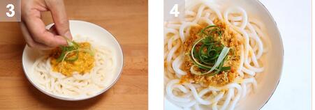 2. 將蟹黃放在烏冬面上,加上蔥絲點綴,即成。