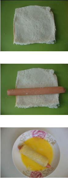 1.吐司切掉四邊,用搟面杖壓實(shí),卷入一個(gè)火腿腸,