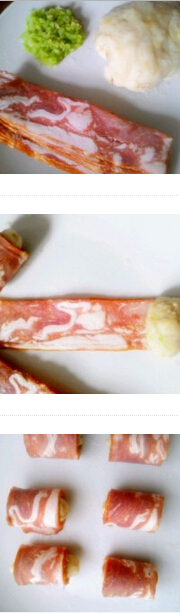 2.一點(diǎn)奶油用手沾水弄成照片那樣放培根上面。培根本來(lái)有鹽味所以土豆泥沒(méi)有放鹽,卷成卷用牙簽扎牢。