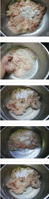 1.大腸放入盆里,加入3勺淀粉,兩勺鹽,然后拿手使勁的搓,大概搓五分鐘左右,然后過清水沖洗干凈