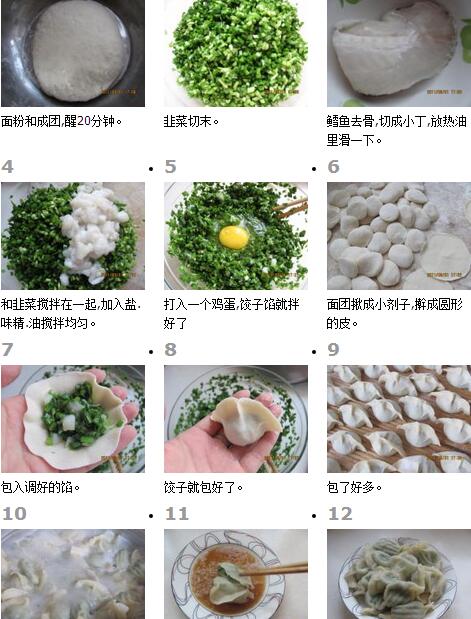 鱈魚韭菜餃子的材料:韭菜200g,鱈魚一塊,雞蛋一個,花生油,鹽,味精一點,面粉250g